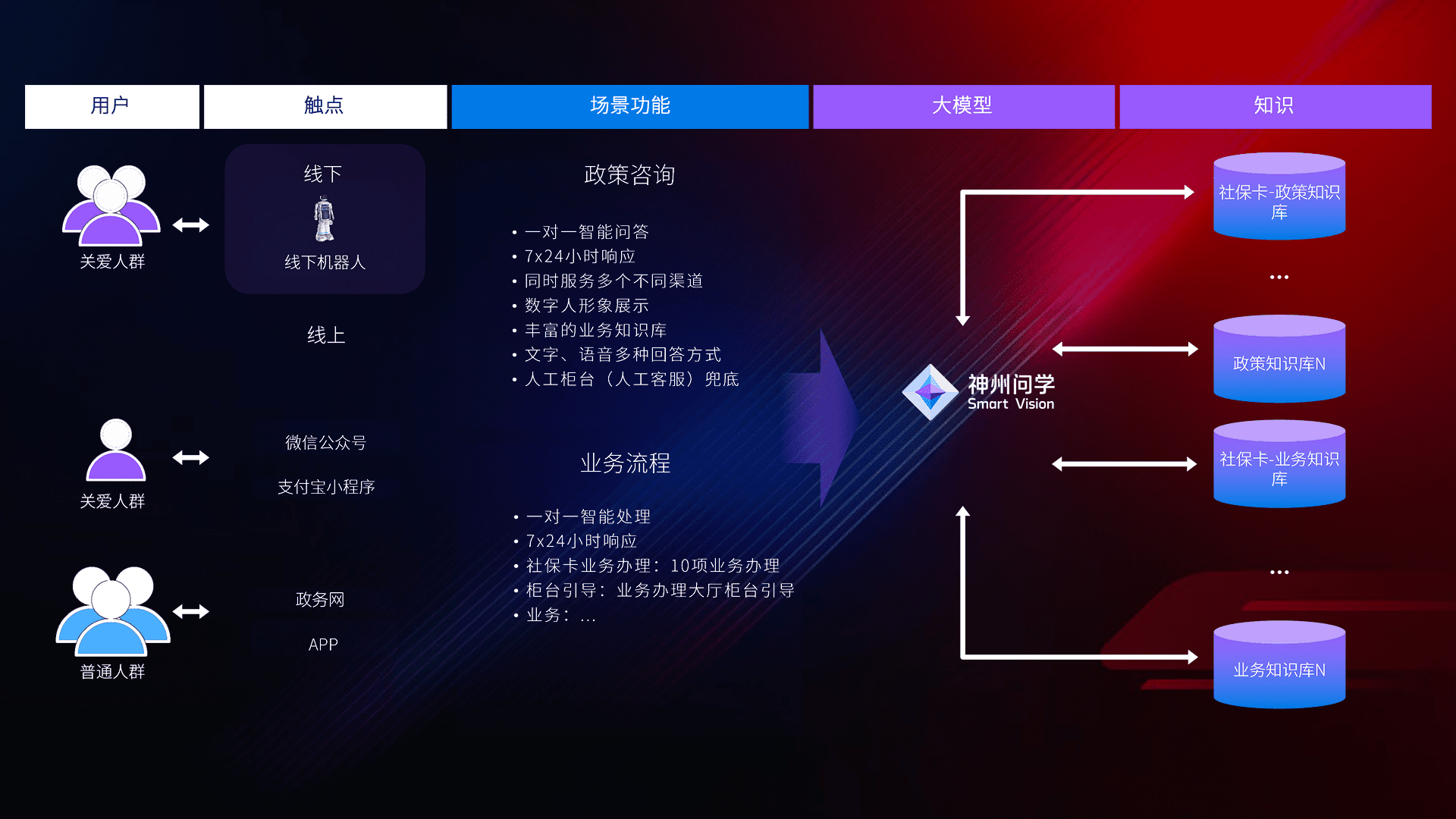 • 利用大语言模型+RAG技术,,,,支持多轮对话,,,,可识别多种同义词、、、近义词,,,,精准理解关爱人群语义快速输出结果。。