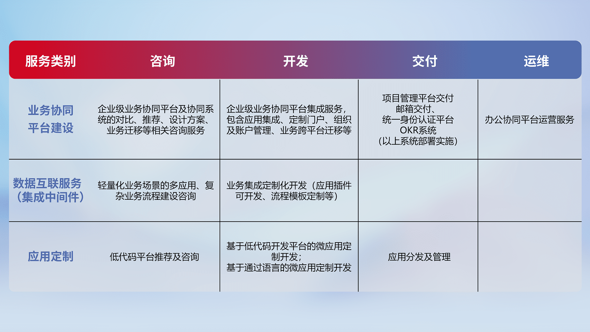 针对钉钉、、、企微、、、、IDaas等平台级产品提供产品的规划、、方案、、、、交付、、、、定制化开发等服务,,,实现如统一协同办公、、、、智能客户服务、、混合会议管理、、智能数据查询、、、等业务场景,,实现数字化转型。。